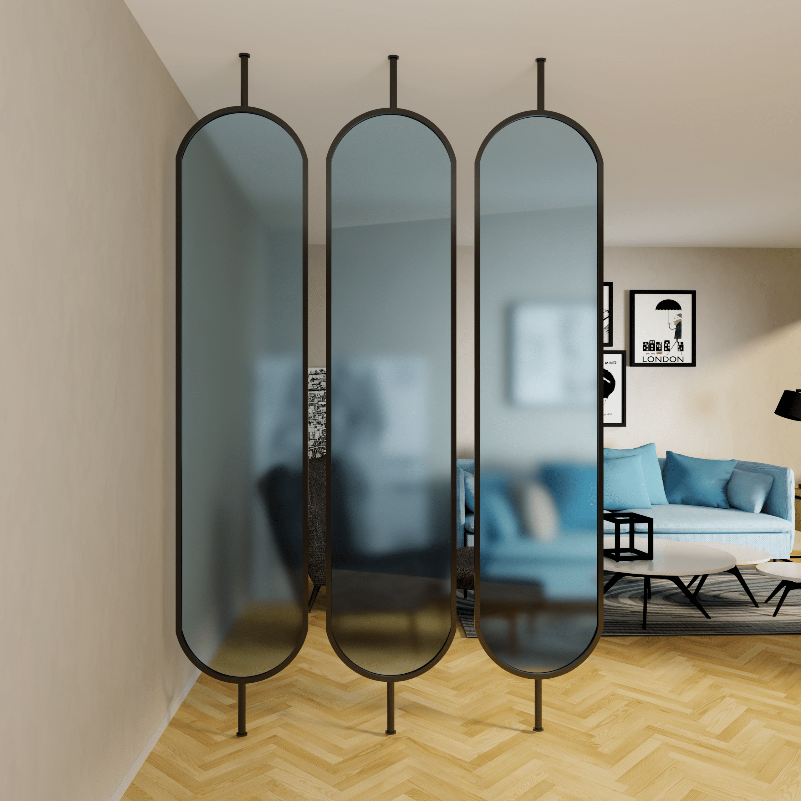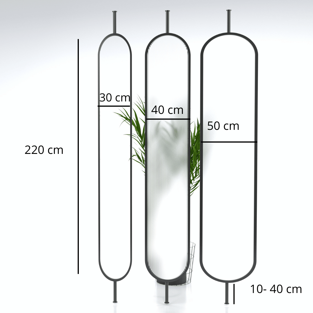 Parawany nordyckie w wersji  bardziej surowej wykonane z metalu malowanego proszkowo w trzech matowych kolorach do wyboru: czarnym, białym oraz złotym ( RAL 1923).  Szkło możecie Państwo wybrać w trzech wariantach szkło przezroczyste, mleczne lub ryflowane . Rama dzięki  specjalnym śrubom umożliwia wymianę szkła w przypadku uszkodzenia. Możliwości dostosowania wysokości parawanu max do 300 cm. Wysokość samego panelu to 220 cm wraz z ramą Szerokość ramy 2,50 cm. Do zamówienia należy dopisać  wysokość nóżki, którą Państwo zamawiacie.
