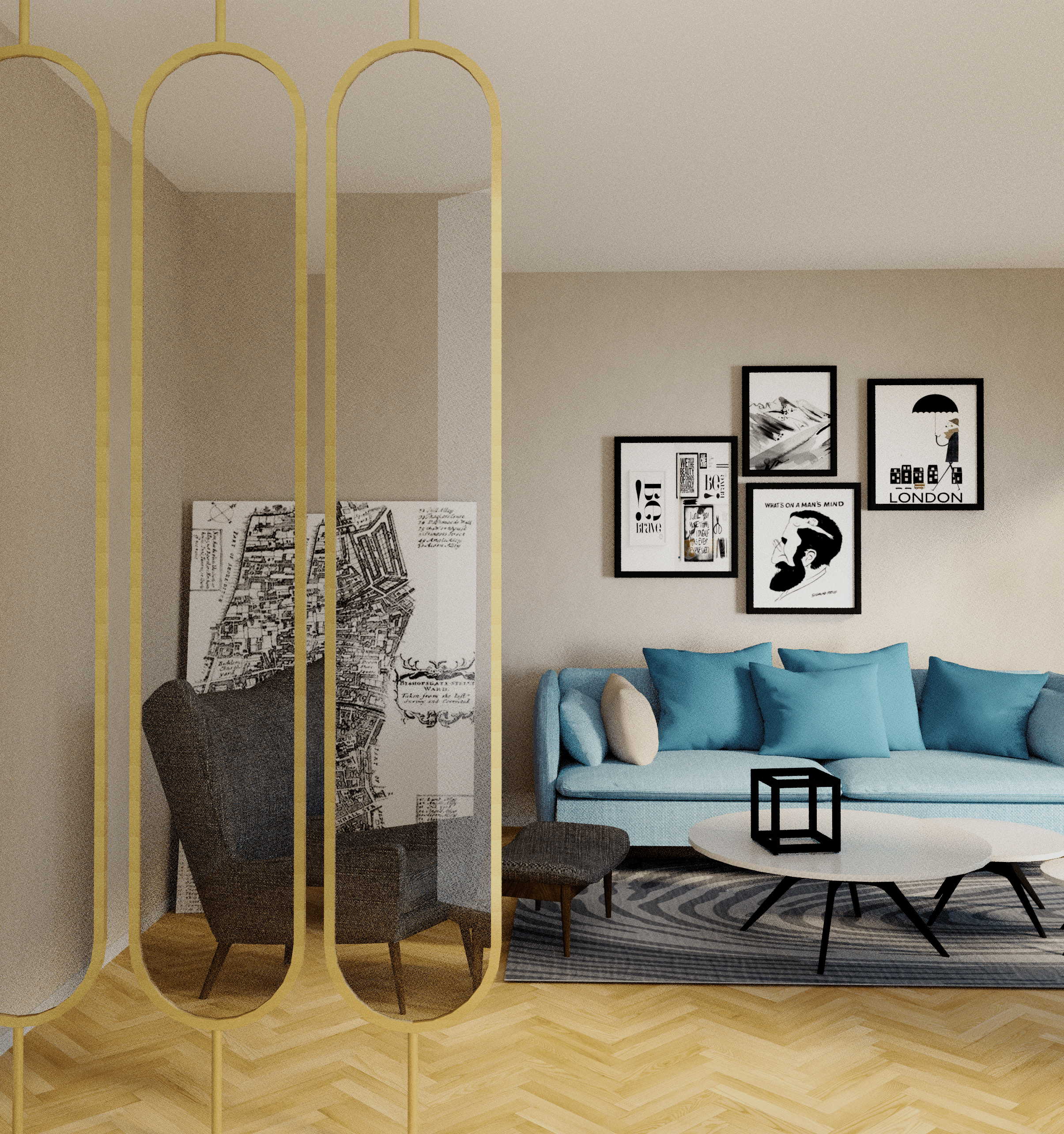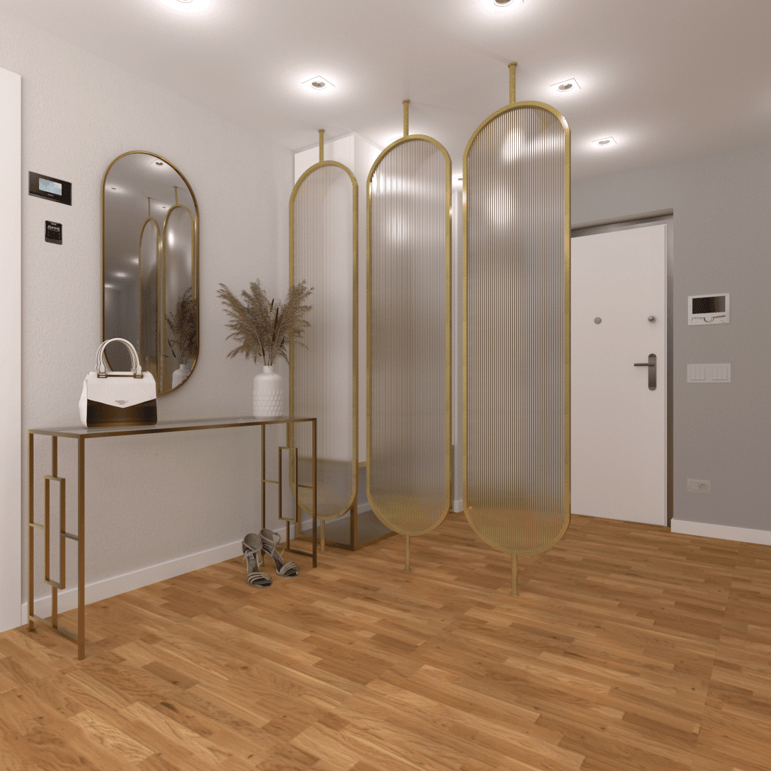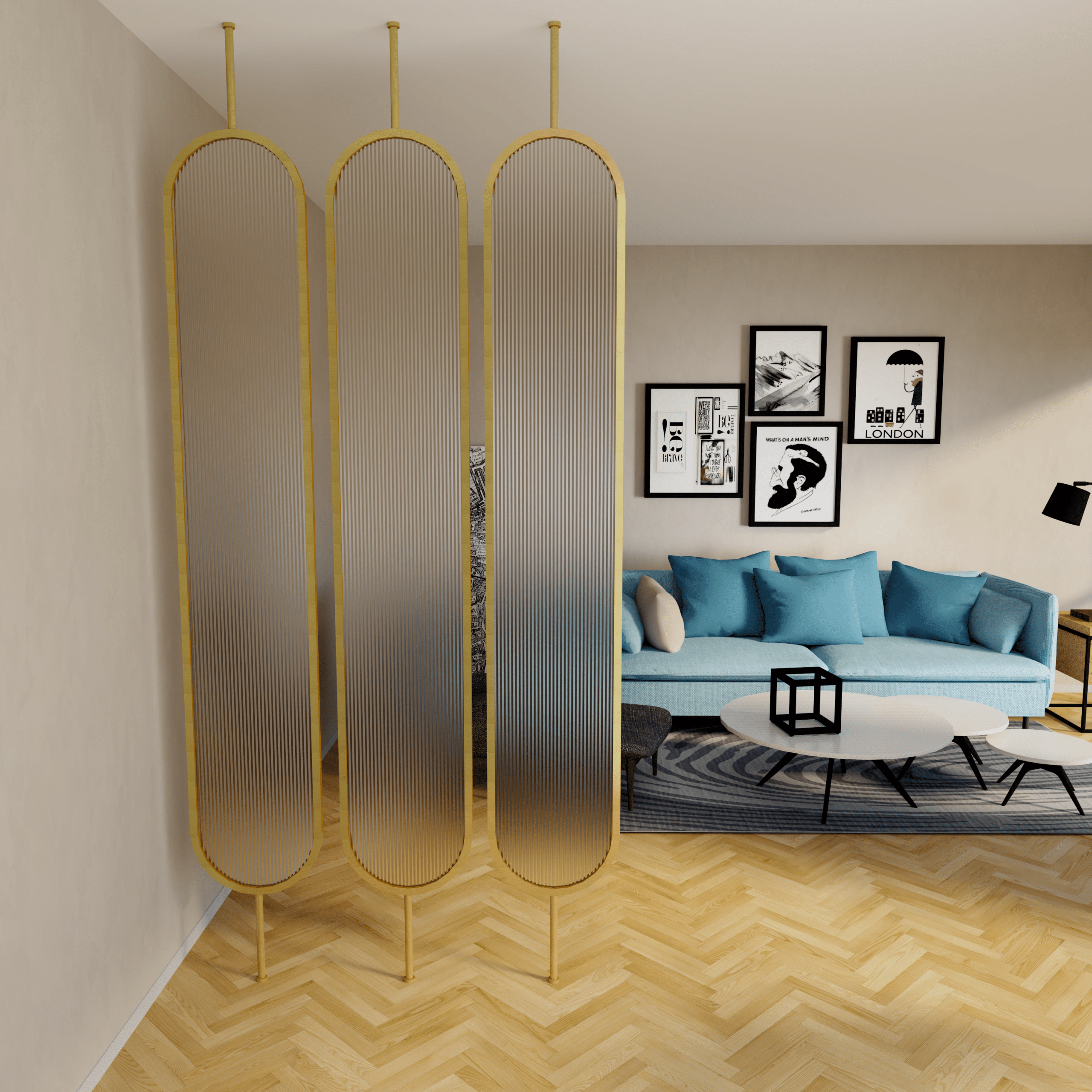 Metalowe parawany nordyckie nadają wyraźnego charakteru wnętrzu, lecz w połączeniu ze złotym wykończeniem, loftowy styl zamienia się w elegancji glamur. Zastosowanie szkła ryflowanego czy mlecznego sprawia,że delikatny sposób dzielimy przestrzeń nie zabierając światła pomieszczeniom.